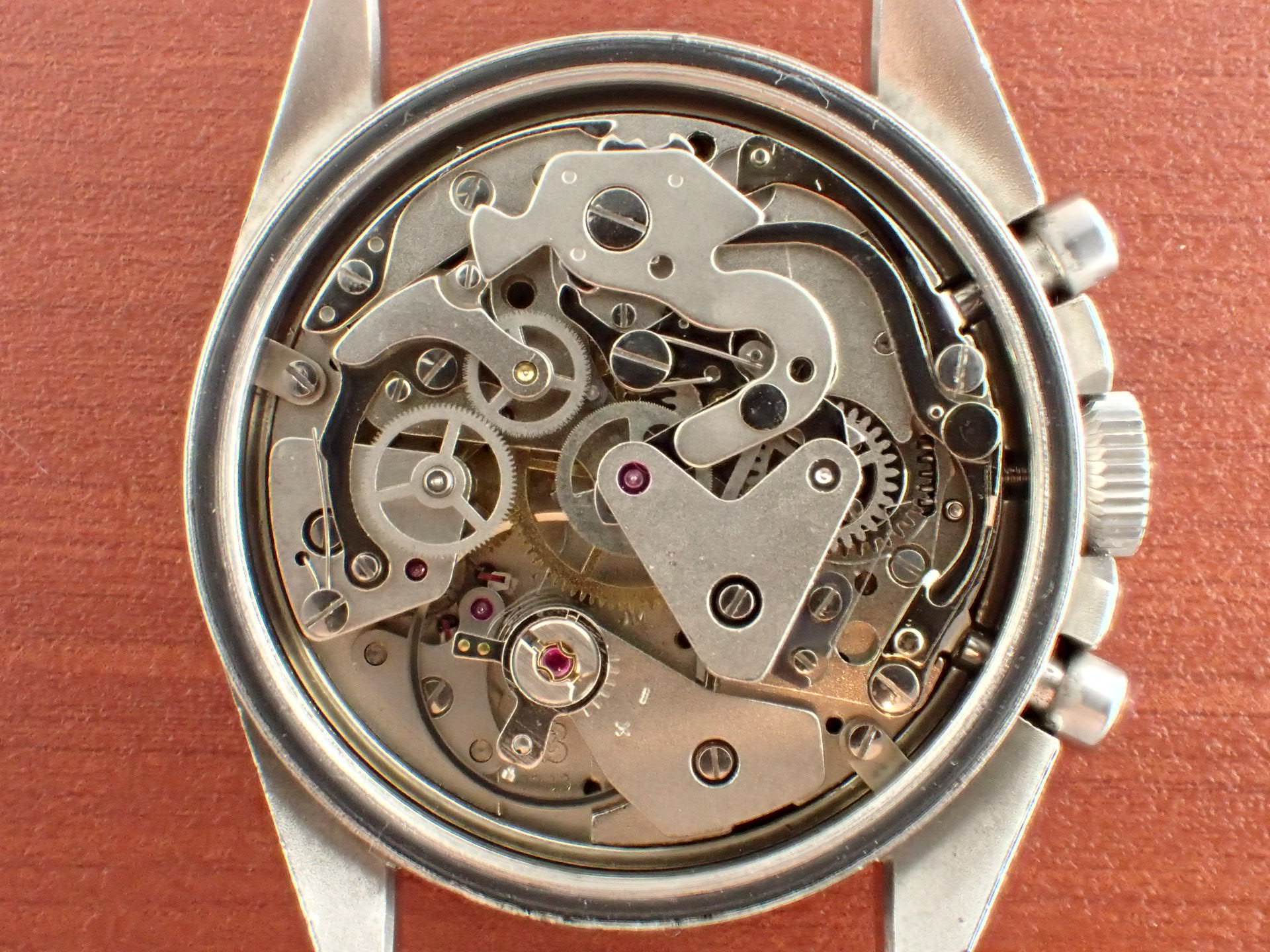 文字盤はブラックマットにプリントのホワイトレターです。文字盤は、経年変化やダメージもなく、大変綺麗な状態です。ケースは小傷がありますが、エッジがしっかりと立っています。ムーブメントも綺麗な状態で、クロノグラフファンクションも問題ありません。分解掃除後のお渡し。