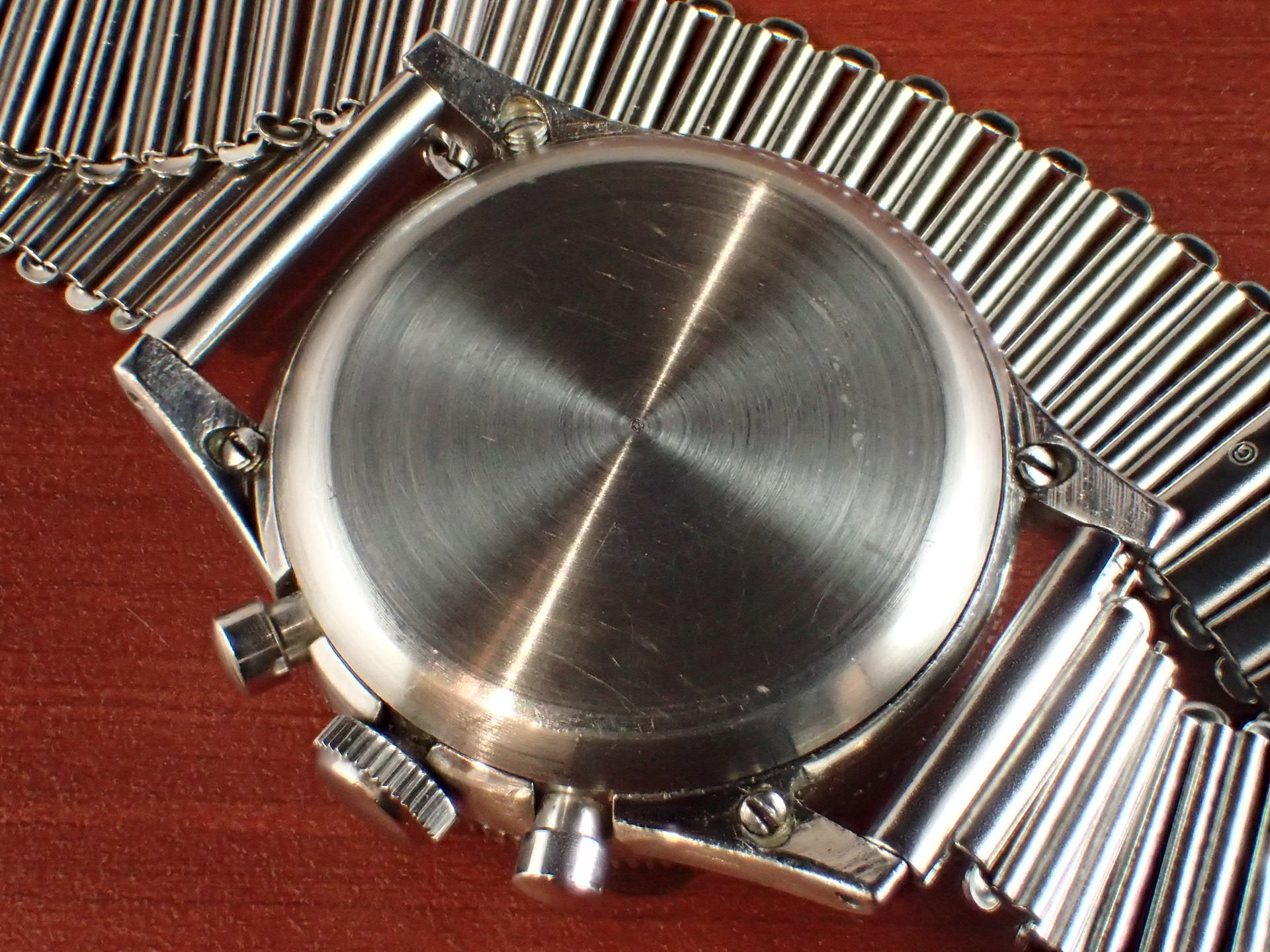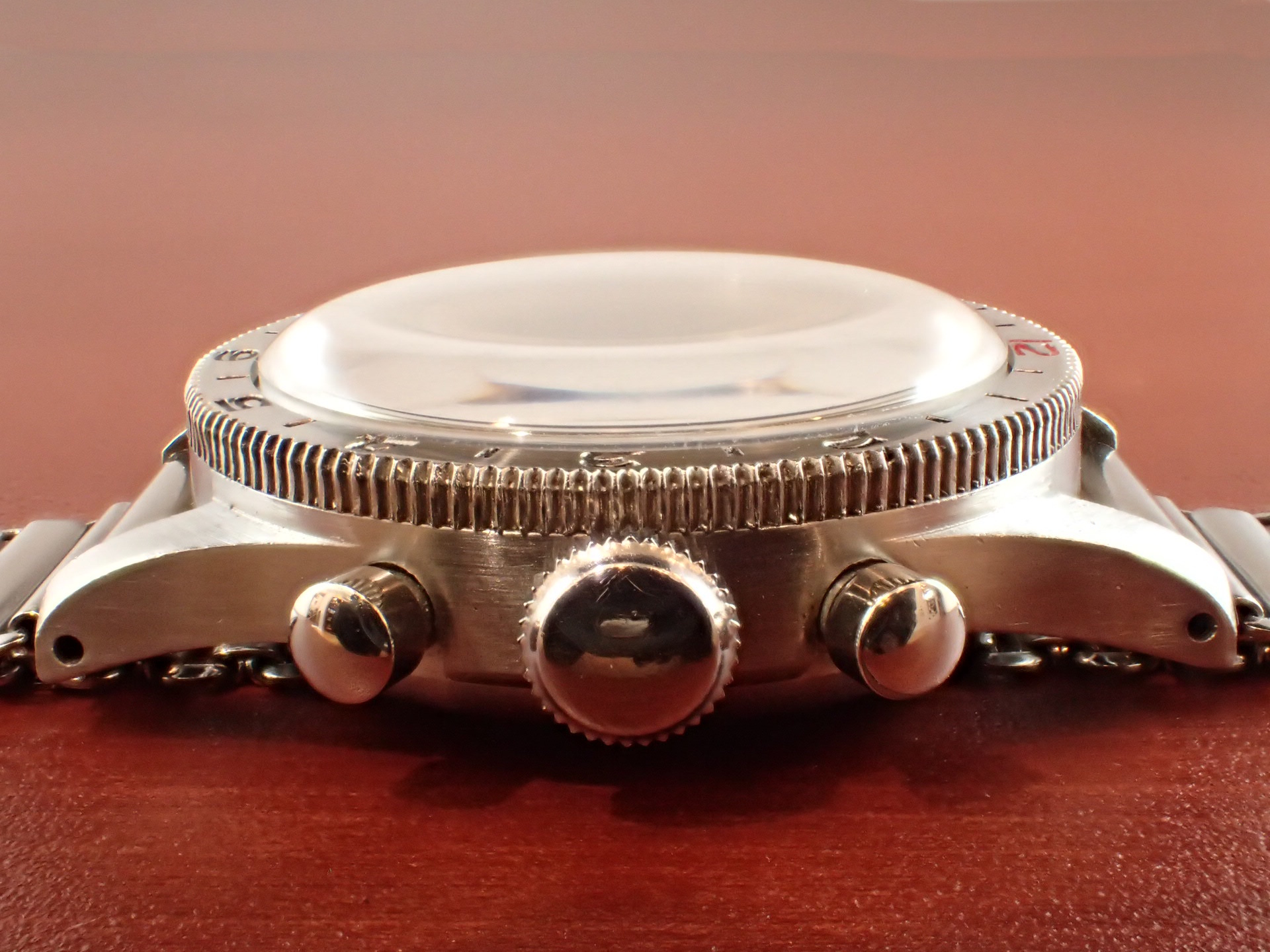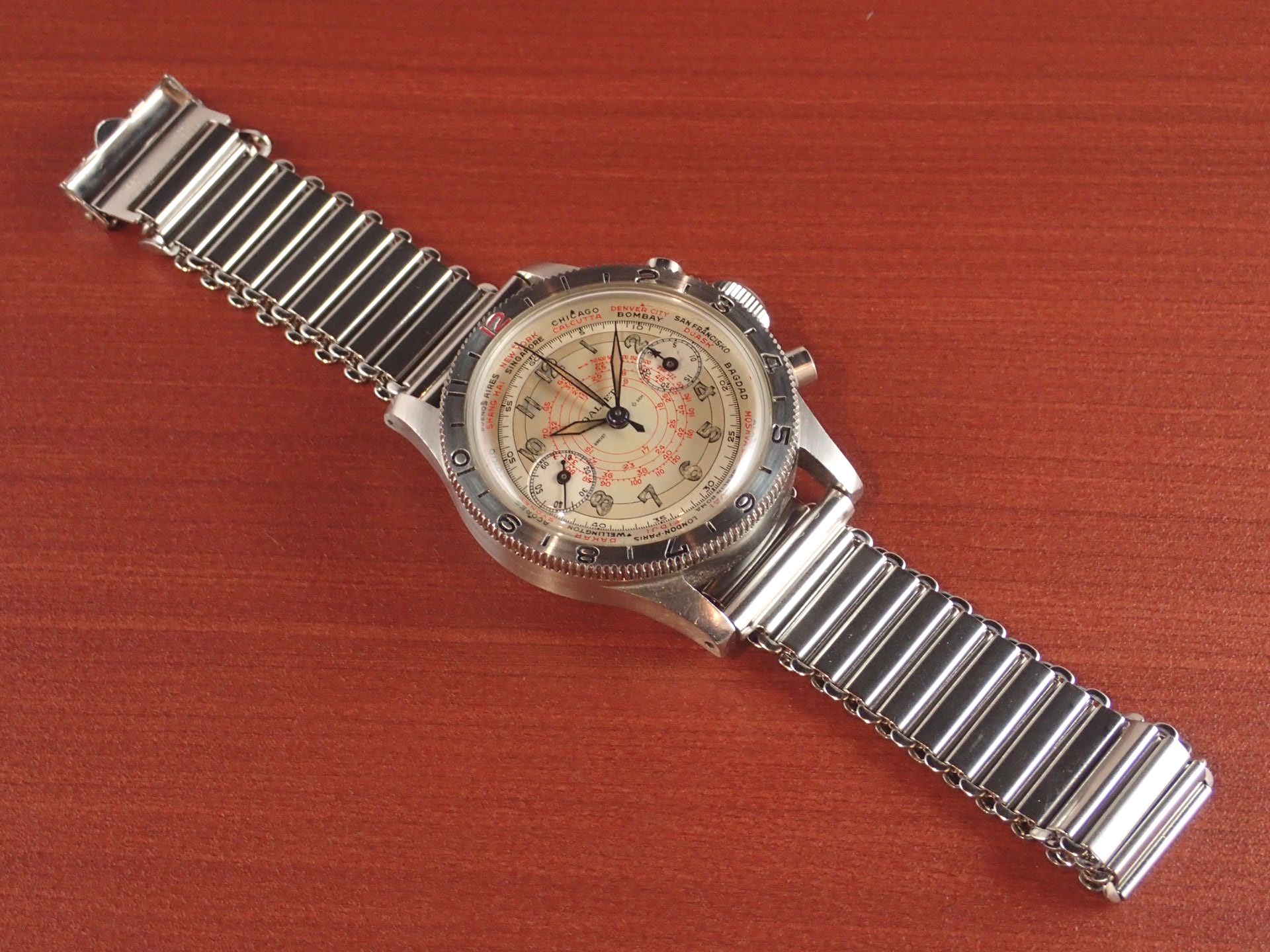 世界で最初にワールドタイム機能を搭載したクロノグラフ、フライングオフィサーのファーストジェネレーションです。こちらのモデルはその前期タイプです。後期タイプとはラグ形状が少し違うのと、インダイアルの大きさが後期タイプより小さいです。フラットの回転ベゼルを装備した4つビス防水ケース。文字盤外周には各国の主要都市を配し、中央には赤色のタキメーター。ケース径34.5mmでこの凝縮感。最高にカッコいい、素晴らしいデザインのモデルです。夜光リーフハンドはとてもシャープで、この針のおかげで全体が締まって見えます。文字盤はホワイトの2トーンダイアル、大きなダメージもなく大変良い状態です。ケースは肉厚で、エッジもしかりと残った状態。ムーブメントはヴィーナス150を搭載。ブレスレットはボンクリップのバンブーブレスレットを取り付けています。こちらは委託品になりますが、当店で分解掃除をしてお渡ししますので、1年間の修理保証書が付属します。