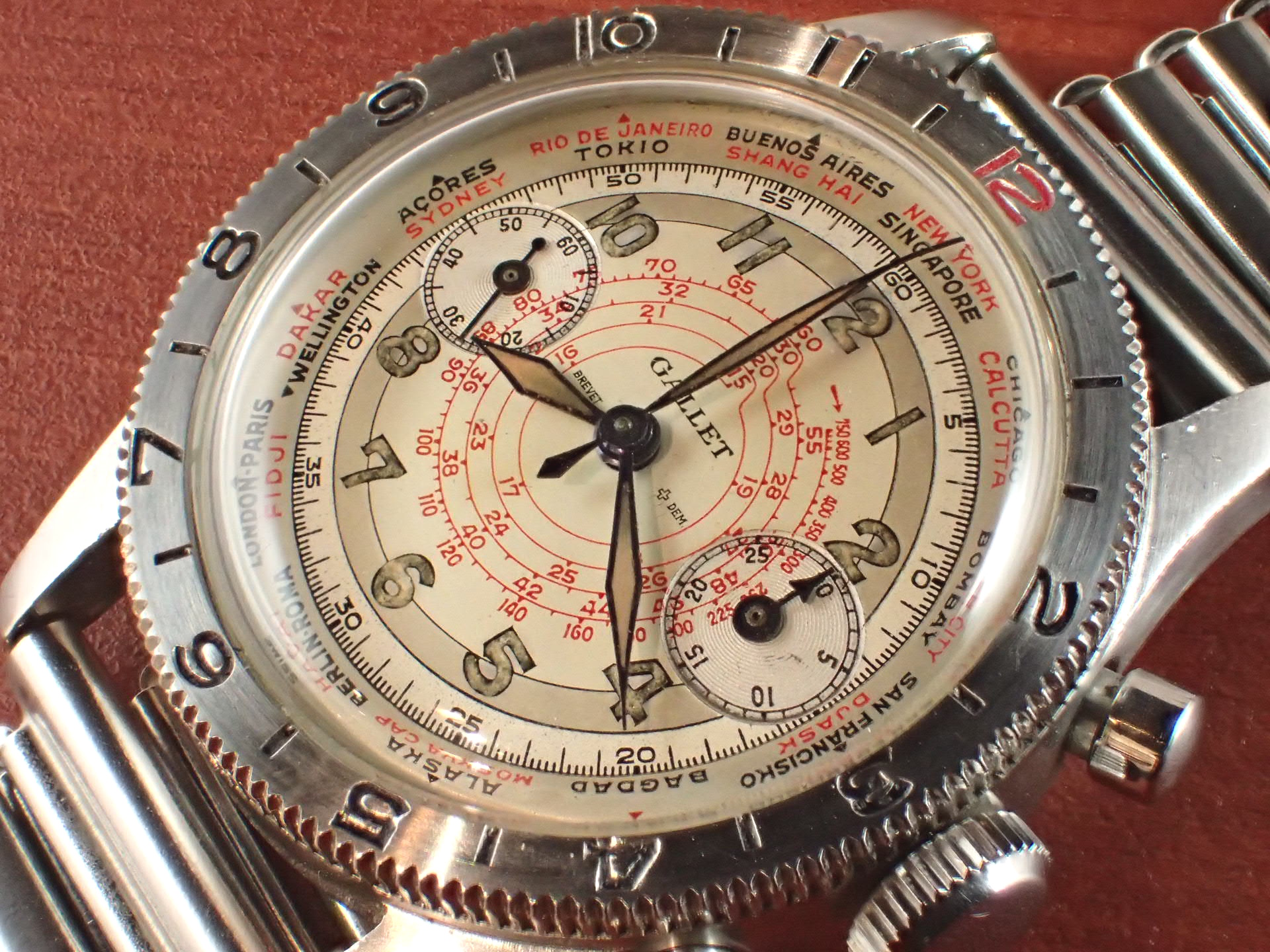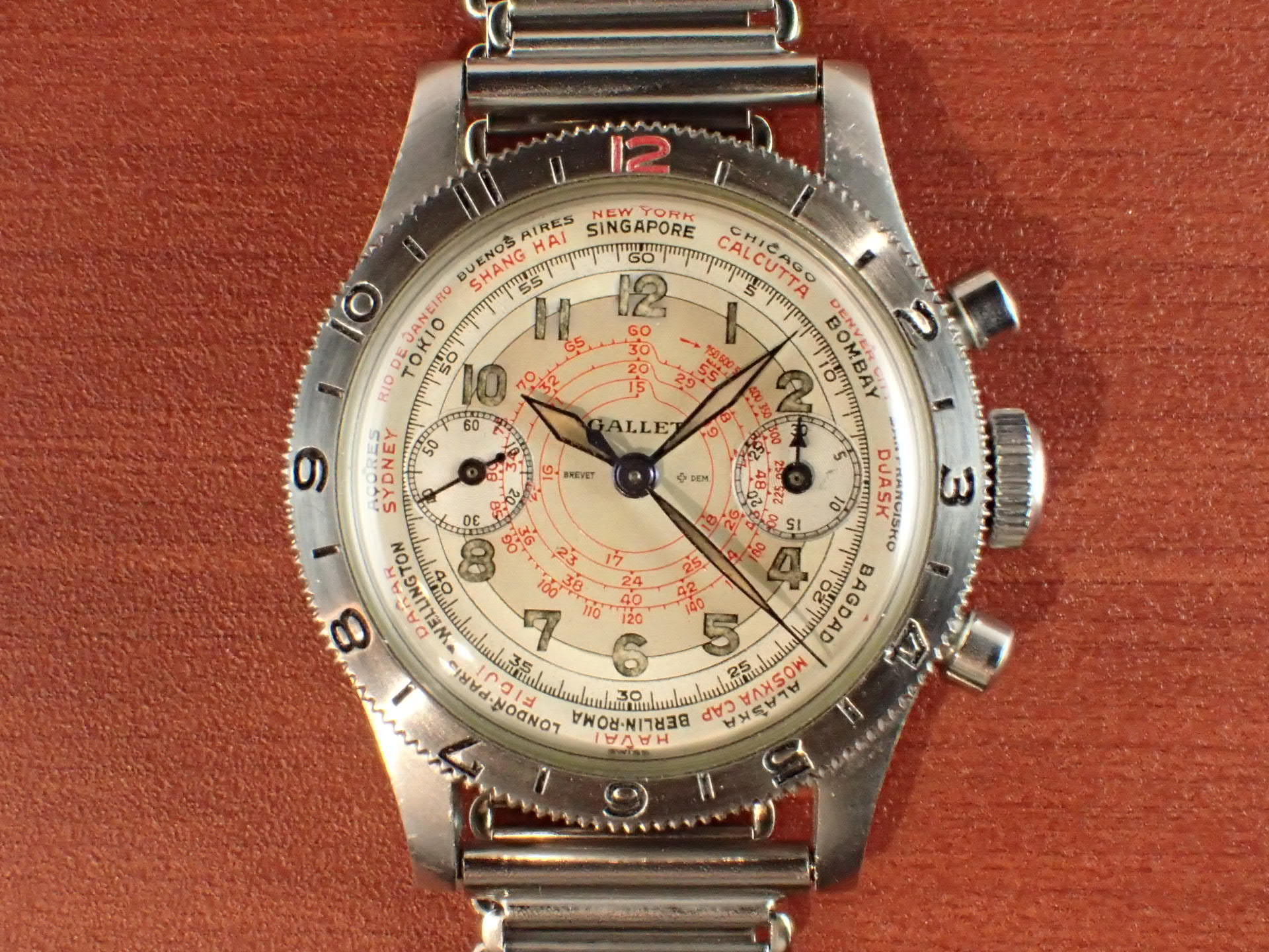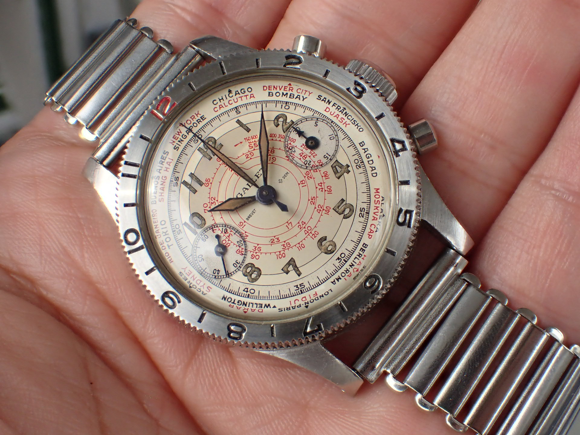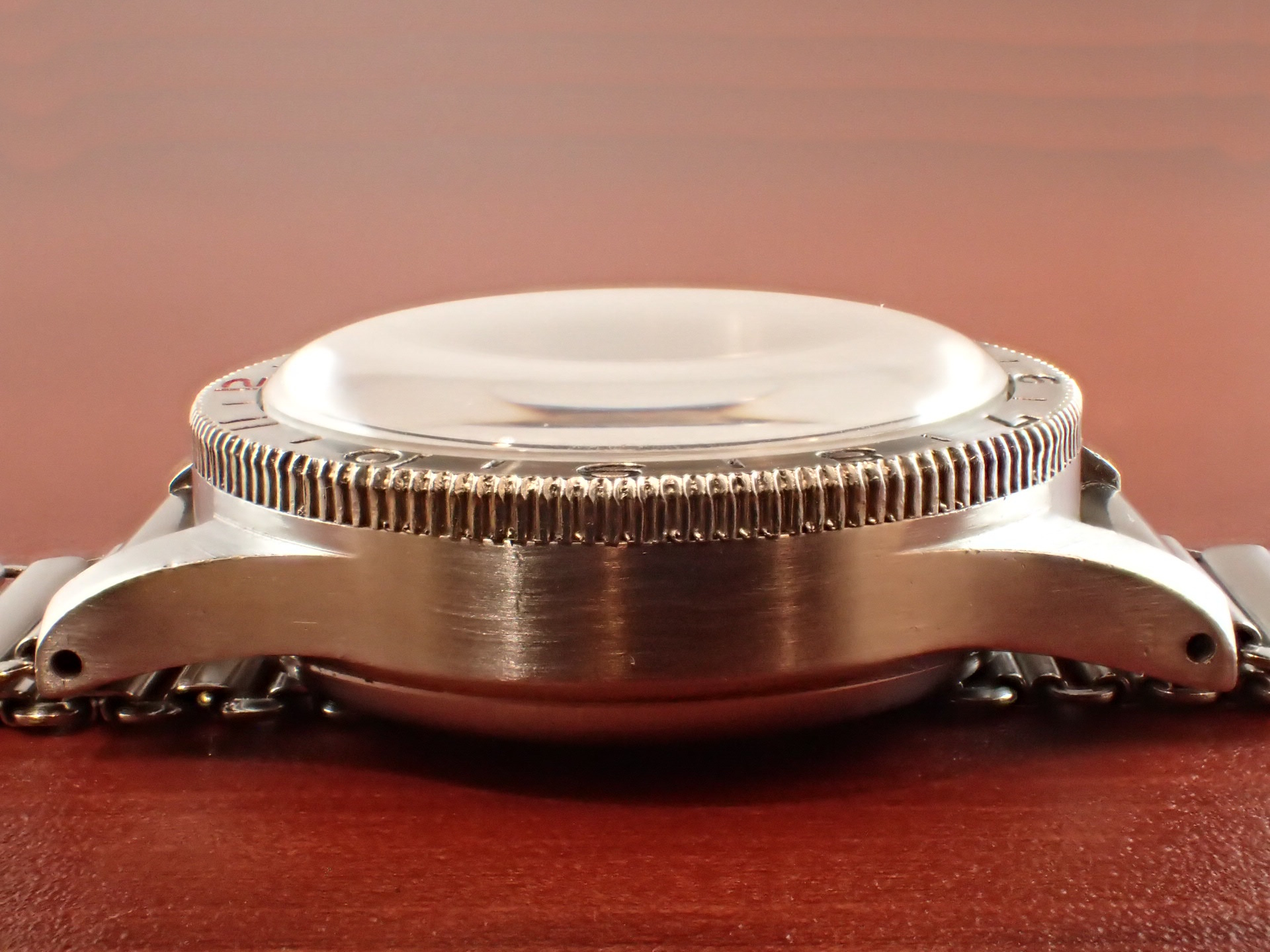 世界で最初にワールドタイム機能を搭載したクロノグラフ、フライングオフィサーのファーストジェネレーションです。こちらのモデルはその前期タイプです。後期タイプとはラグ形状が少し違うのと、インダイアルの大きさが後期タイプより小さいです。フラットの回転ベゼルを装備した4つビス防水ケース。文字盤外周には各国の主要都市を配し、中央には赤色のタキメーター。ケース径34.5mmでこの凝縮感。最高にカッコいい、素晴らしいデザインのモデルです。夜光リーフハンドはとてもシャープで、この針のおかげで全体が締まって見えます。文字盤はホワイトの2トーンダイアル、大きなダメージもなく大変良い状態です。ケースは肉厚で、エッジもしかりと残った状態。ムーブメントはヴィーナス150を搭載。ブレスレットはボンクリップのバンブーブレスレットを取り付けています。こちらは委託品になりますが、当店で分解掃除をしてお渡ししますので、1年間の修理保証書が付属します。