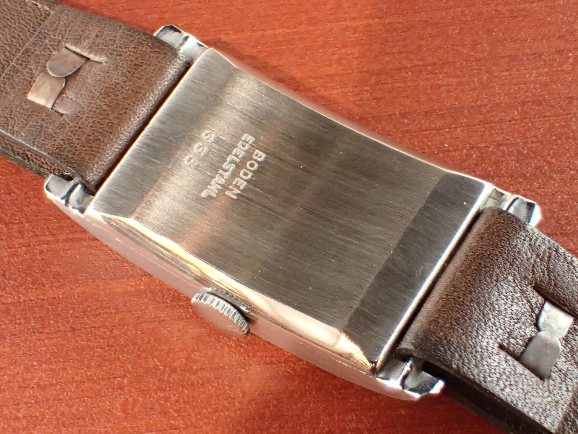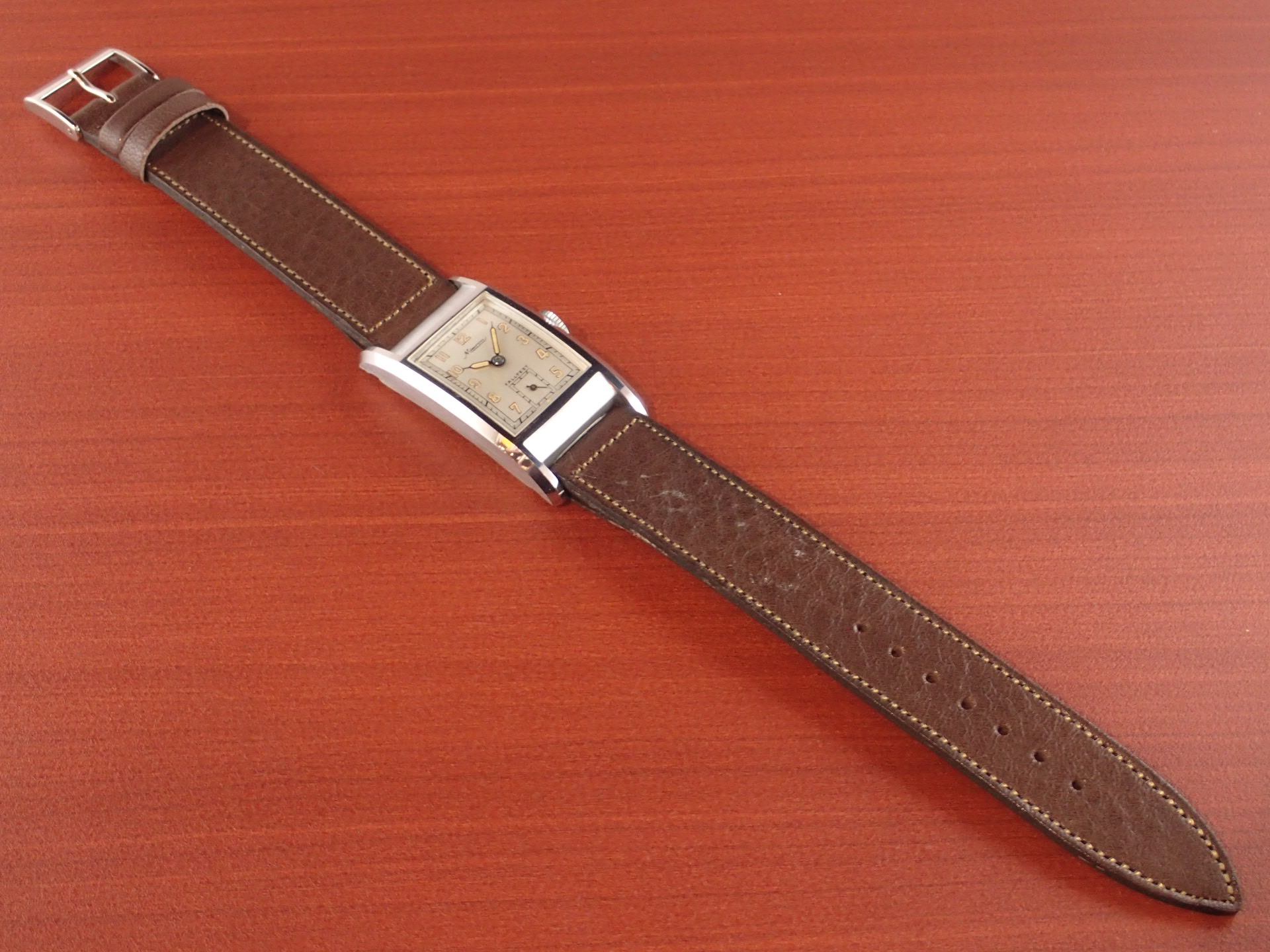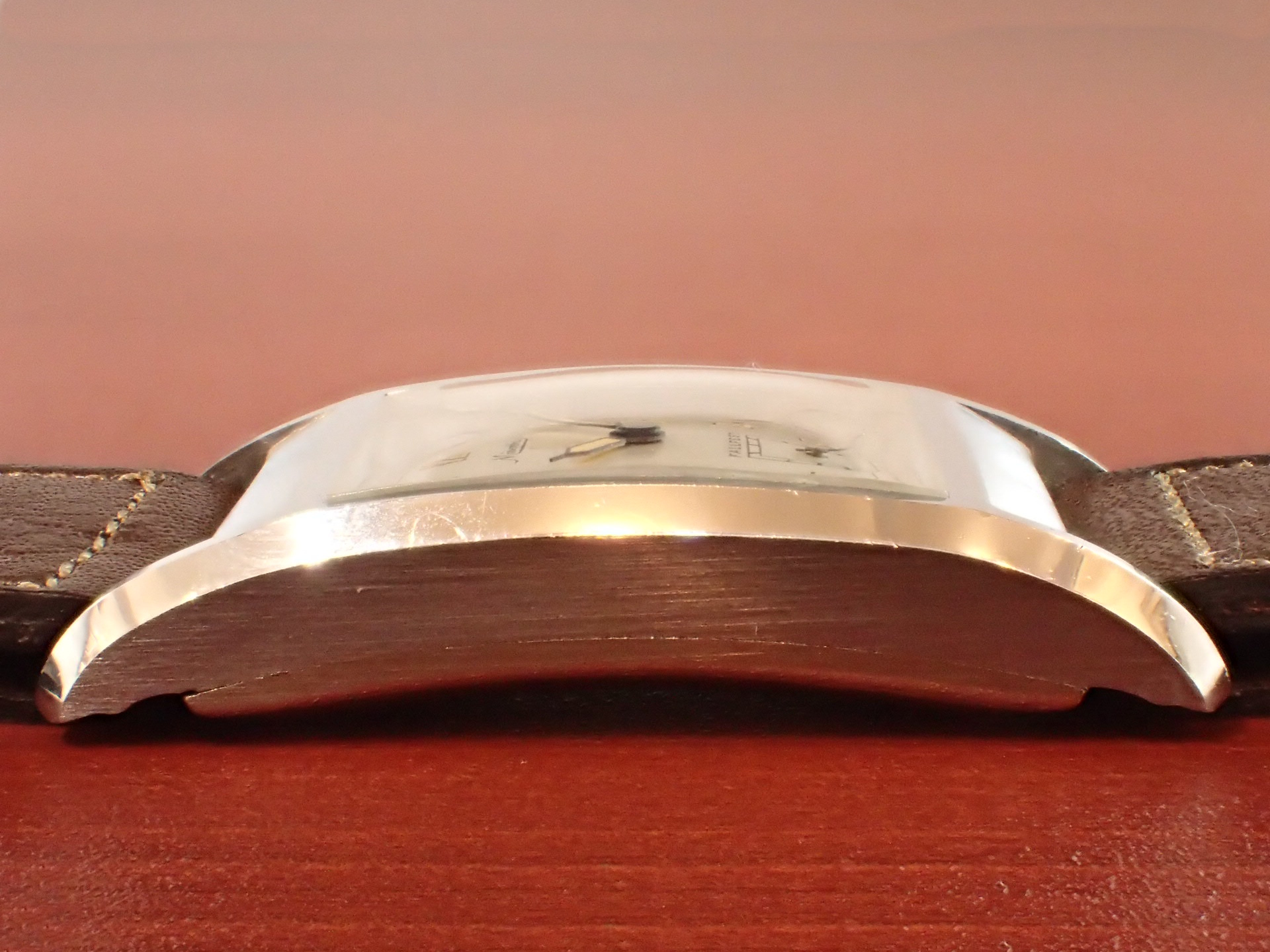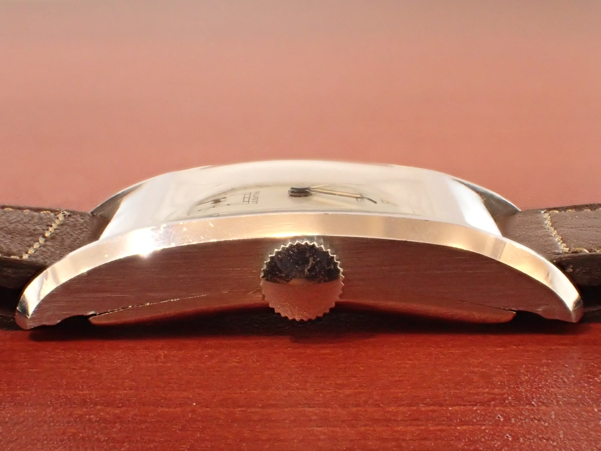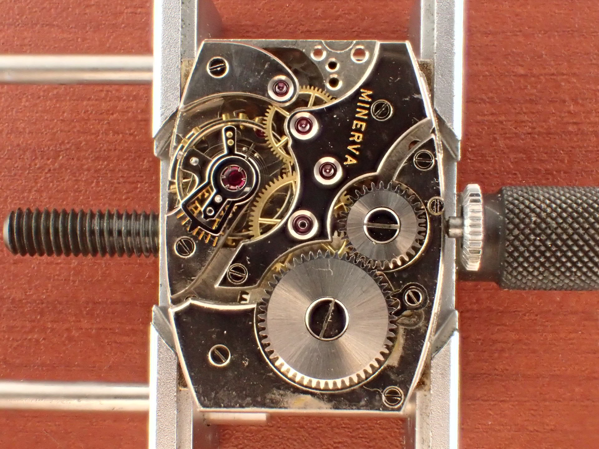 稀少性の高いミントコンディションのミネルバ レクタンギュラーです。最近はめっきり市場で見かけなくなりました。文字盤デザインはオーソドックスですが、雰囲気は良く、コンディション良好です。リューズもオリジナルです。文字盤は極僅かな経年変化が見られますが、良い状態を維持しています。ケースはアンポリッシュで、当時のシェイプを残した良い状態です。裏蓋には工具を滑らせたキズがあります。ムーブメントは、ETA735をリファインした定番ムーブ。ショックレジスティングの耐震装置付き。ブリッジに「MINERVA」の文字があります(ムーブは後日UPします)。ダストカバー付きで状態も良好。ベルト取付部はパリス管(はめ殺し)です。