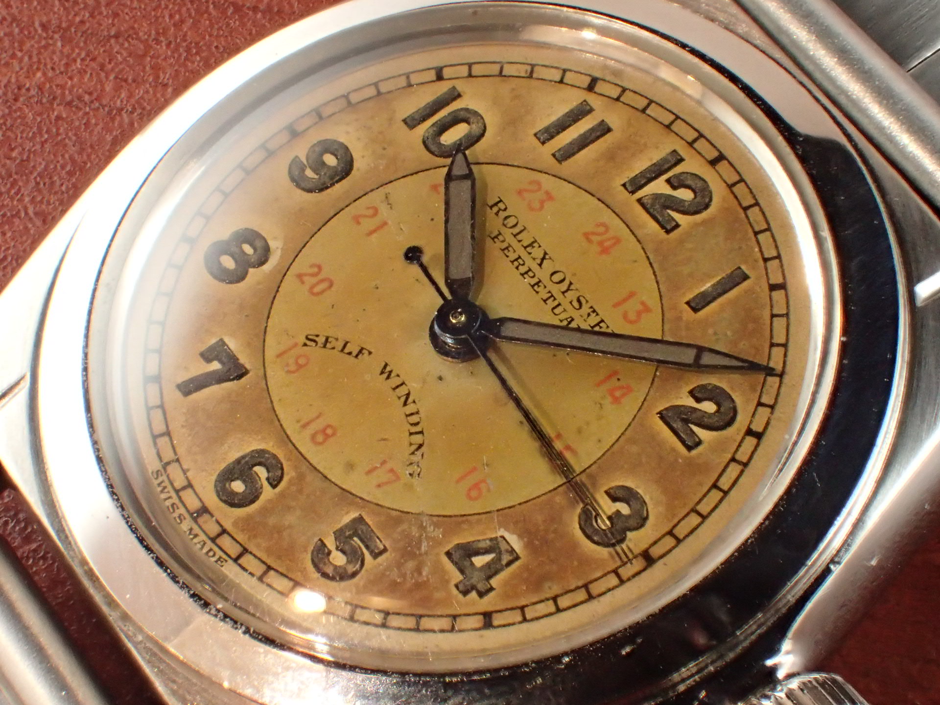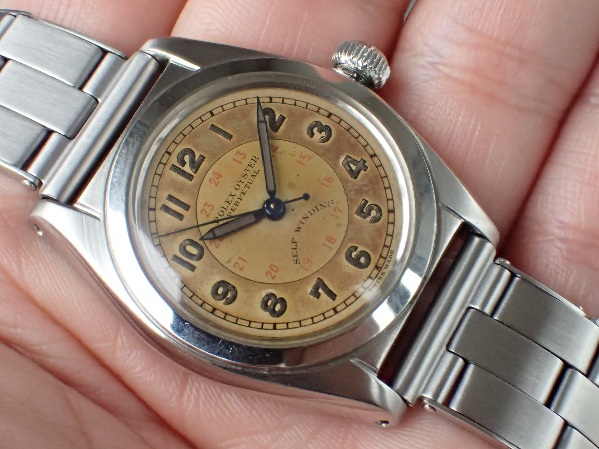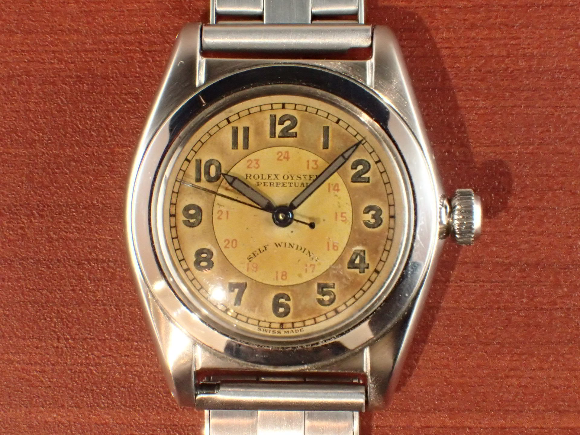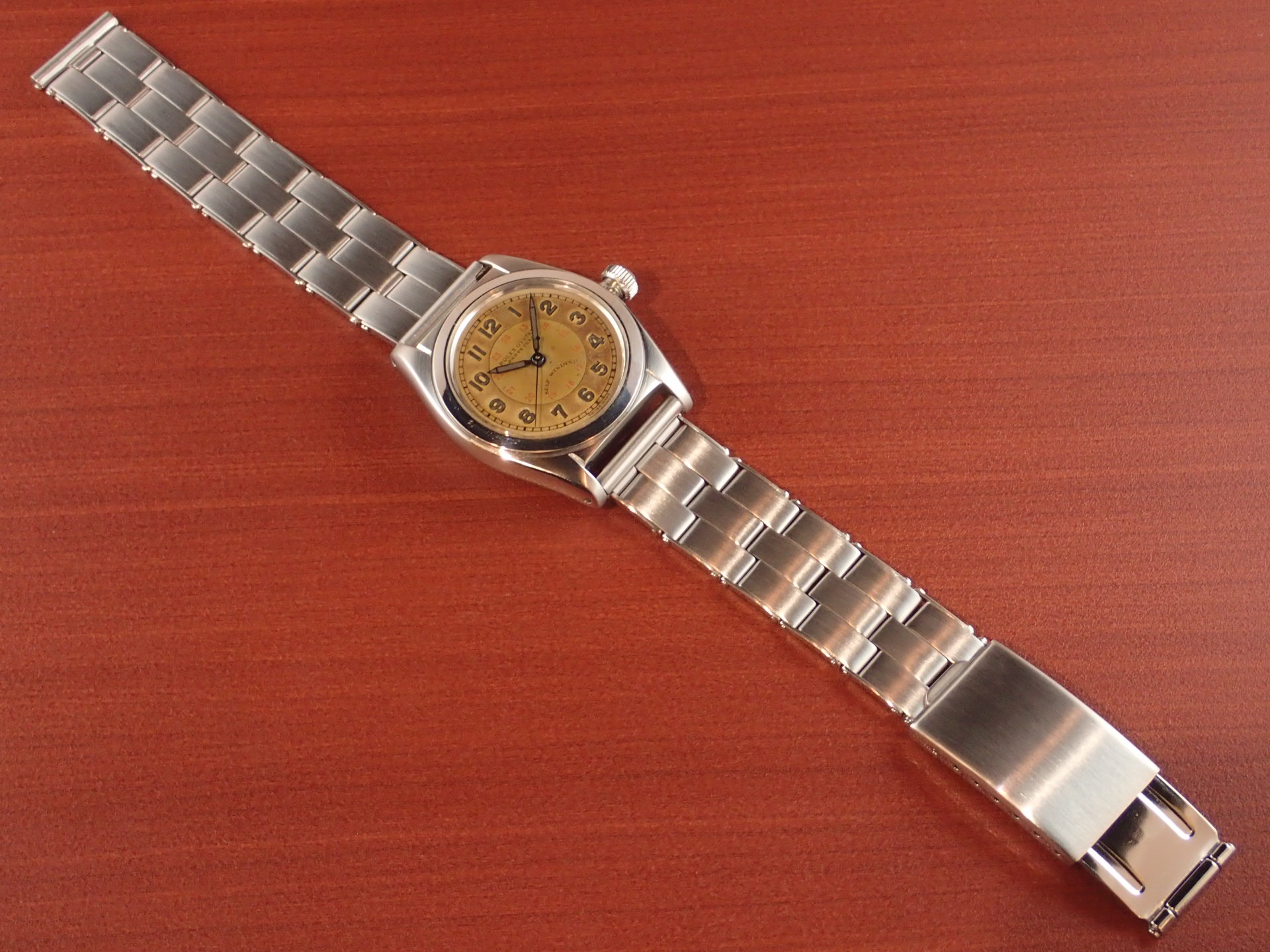 1940年代に製造されたバブルバックです。バブルバックとしては珍しい文字盤デザインで、シルバーの2トーン、インデクスの内側に赤いプリントで24時間表記が入っています。文字盤は全体が飴色に経年変化しており、微細な小傷がありますが、目立つ大きな傷はありません。針はブルースチールで、若干の変色はありますが、綺麗な青色をしています。ケースは少々のポリッシュ感がありますが、概ね良好な状態です。リューズのねじ込みは問題ありません。ブレスレットはプライベートアイズ製のリベットブレスで、装着感、マッチングはとても良いです。ブレスレットは手首周り18.5cmの方まで対応可能です。分解掃除後のお渡し。