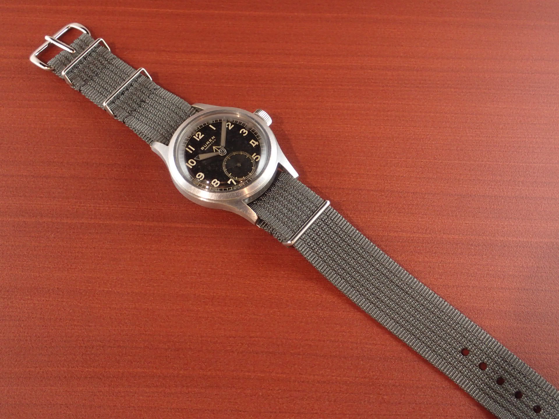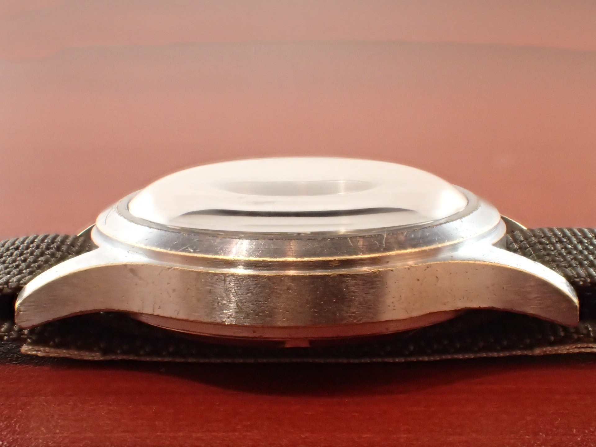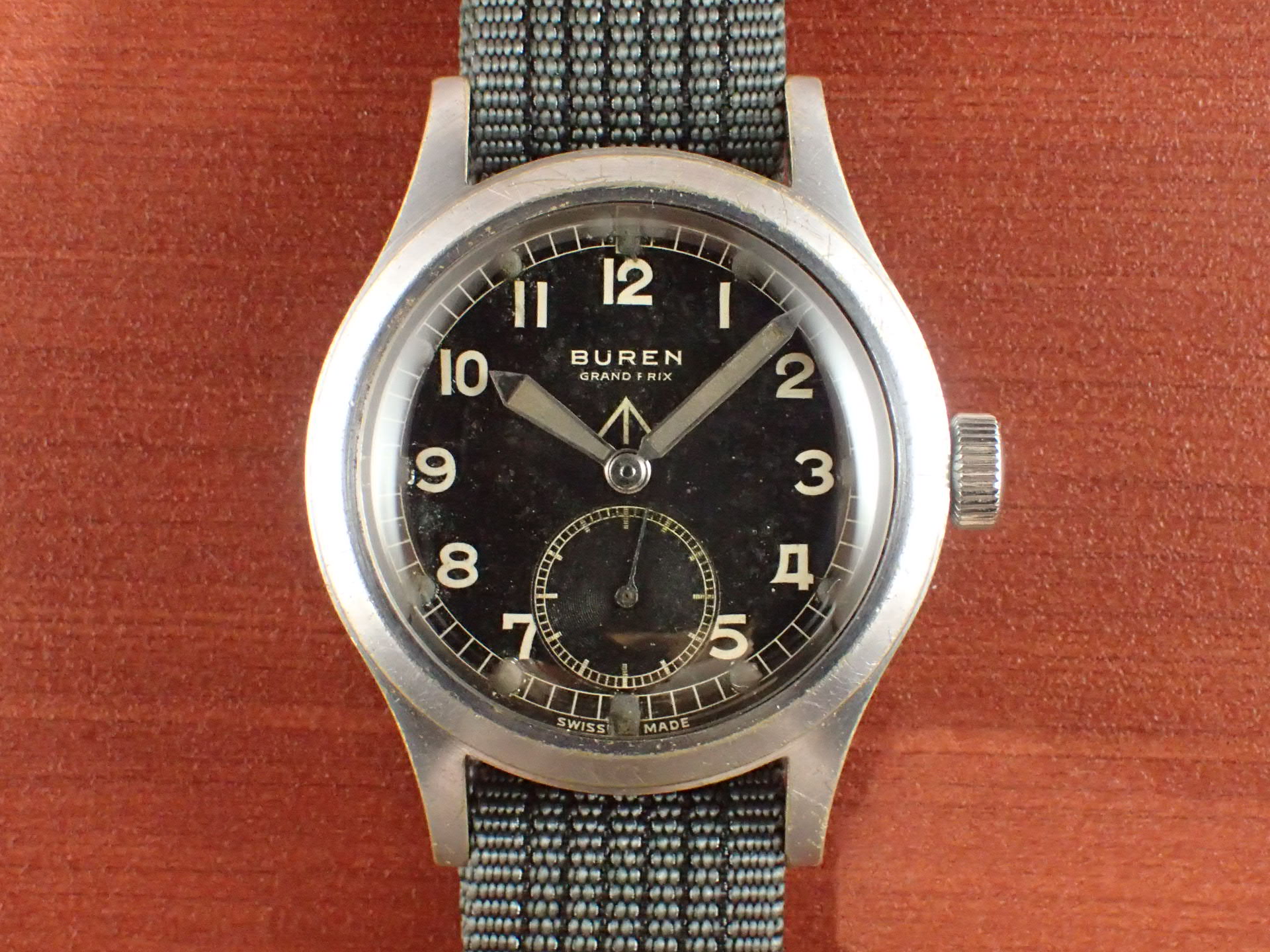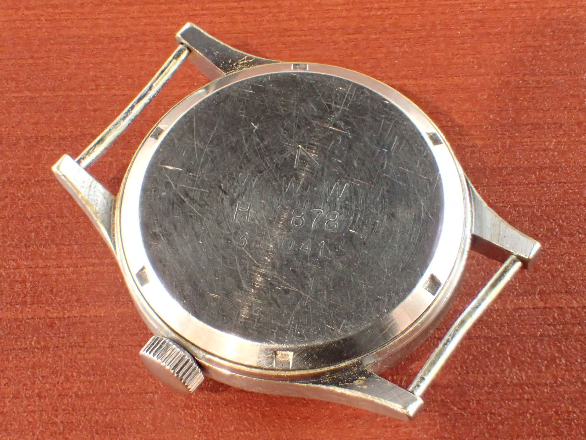 1940年代にイギリス陸軍に納入されたビューレンのW.W.W.(ダーティダース)が入荷しました。製造数は11,000個という記録があります。機止めを兼ねた軟鉄のインナーケースを装備しています。文字盤は目立つ傷や汚れはなく、綺麗な状態です。ケースはクロムメッキにSSバック、「H」はビューレンを表す管理記号です。ケースは多少の小傷と僅かにメッキが薄れた箇所がありますが、非常にコンディションの良い部類です。ムーブメントは、ダメージのない綺麗な状態です。ベルト取り付け部はパリス管(はめ殺し)です。分解掃除済みで、日差30秒程度で稼働しています。