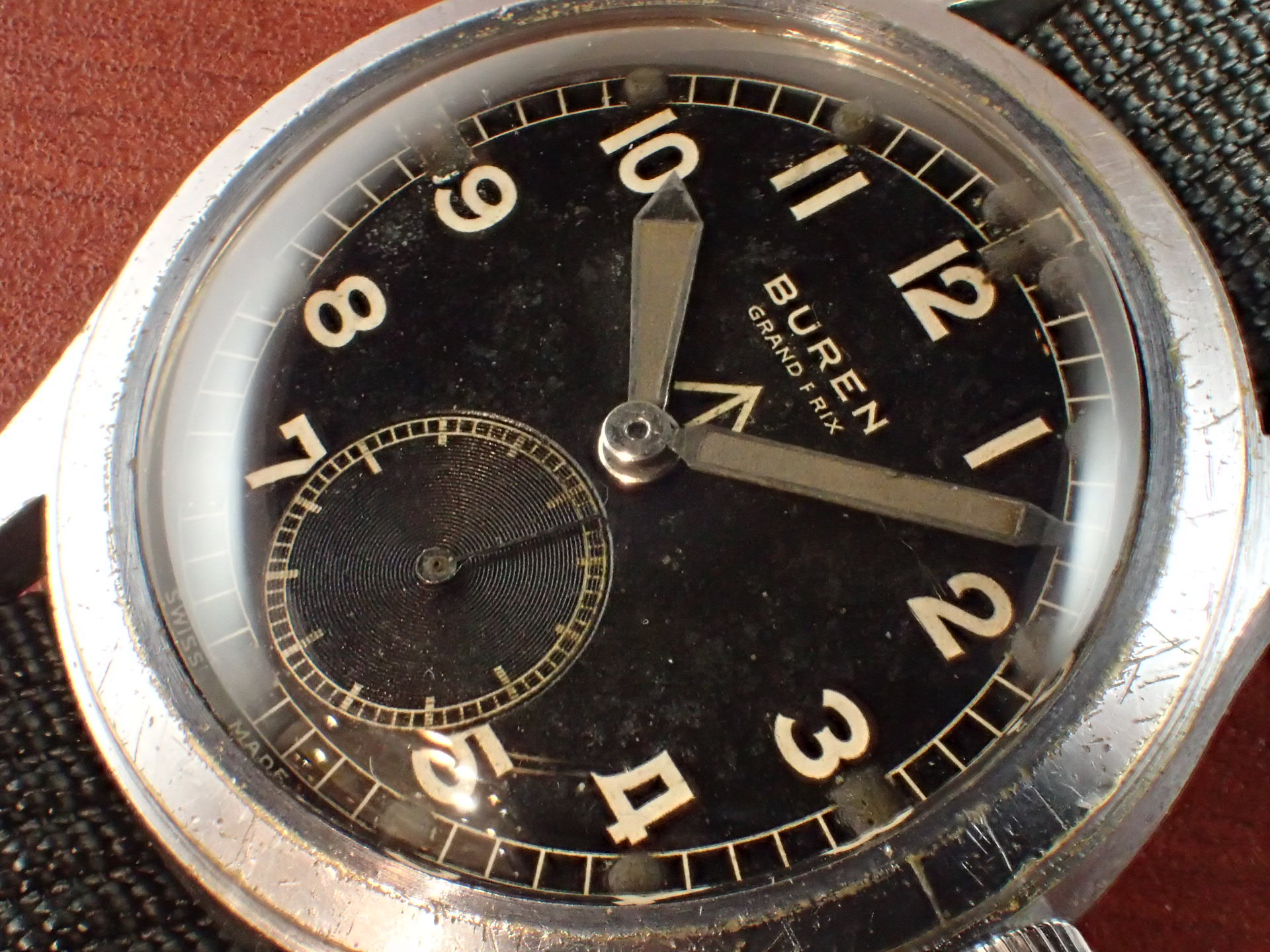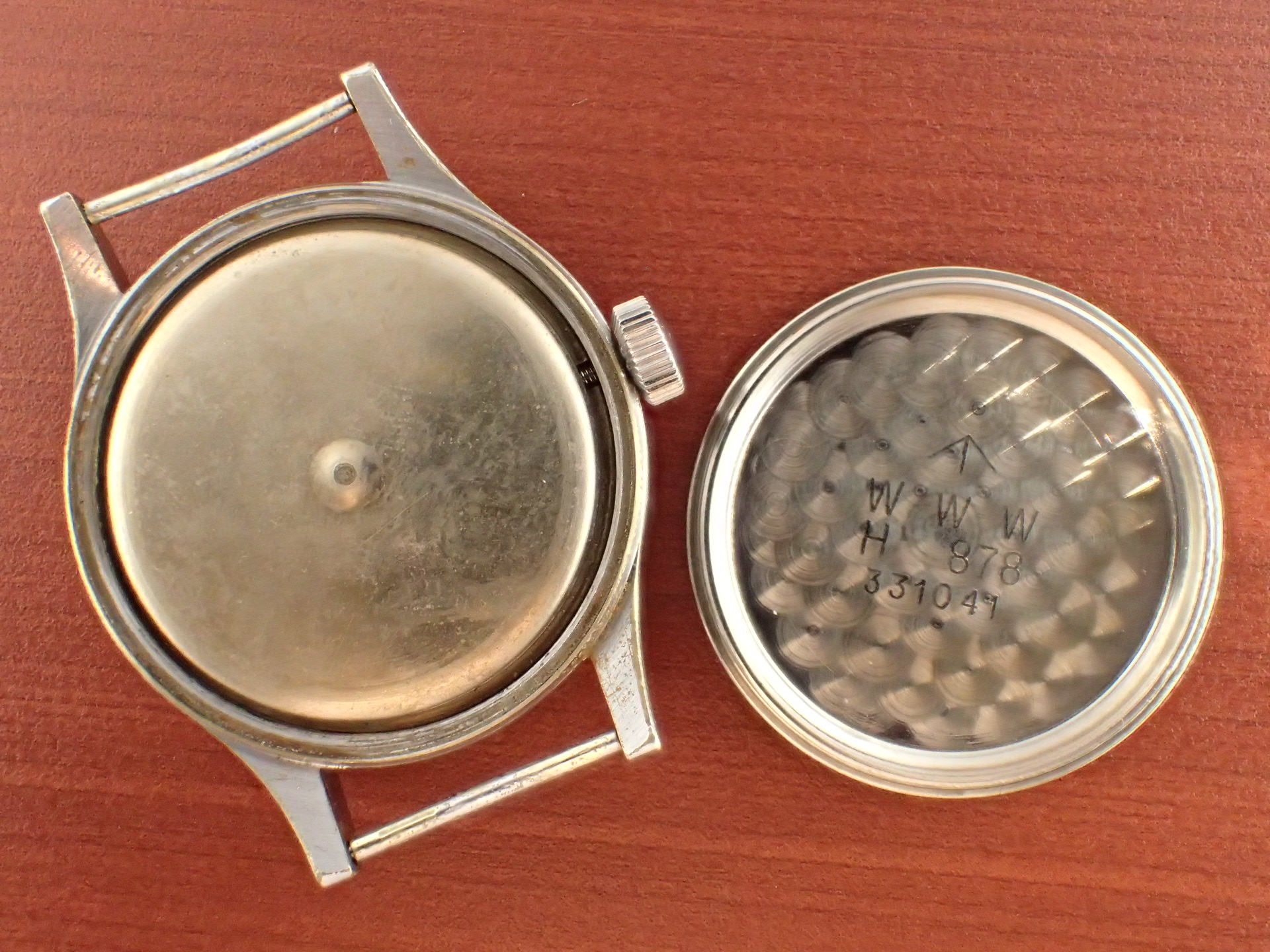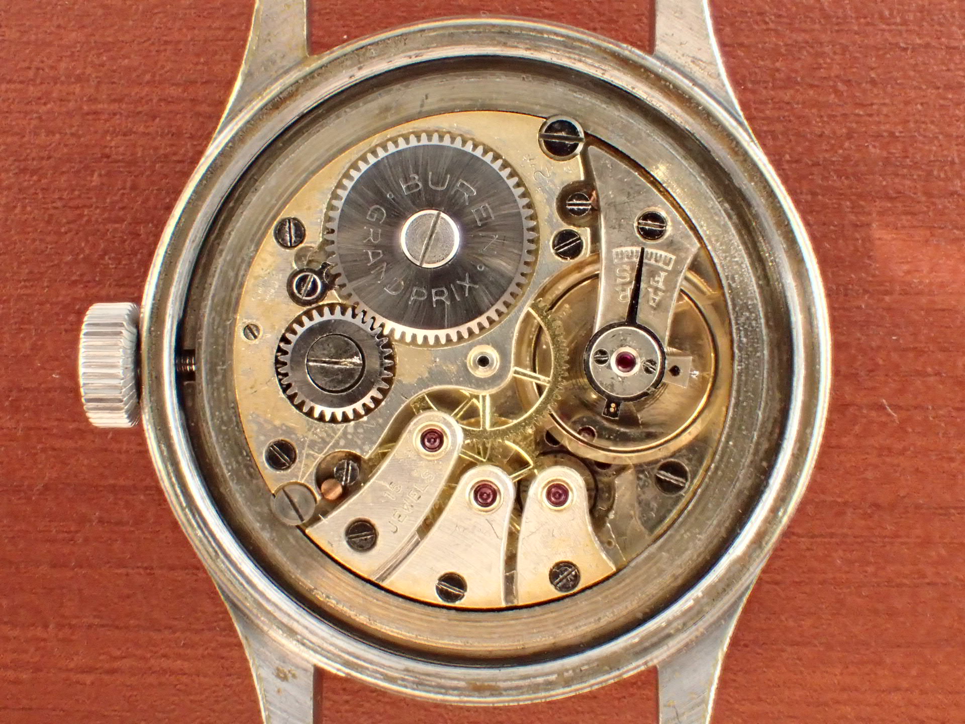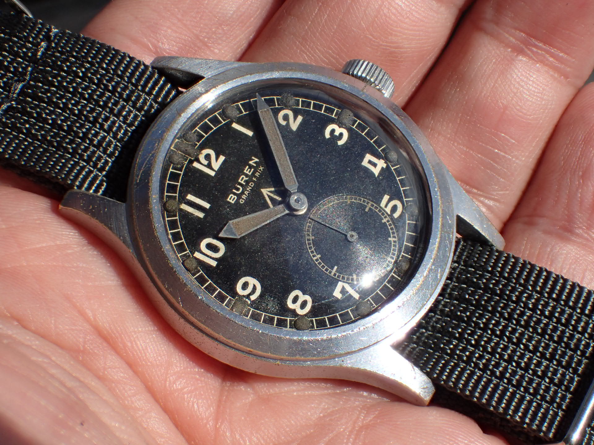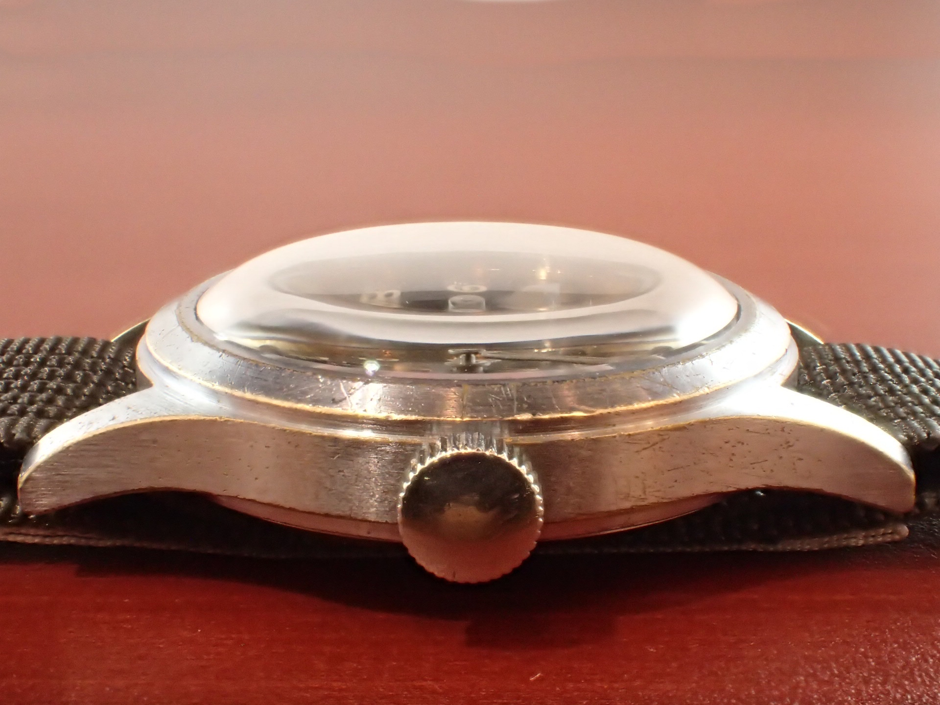 1940年代にイギリス陸軍に納入されたビューレンのW.W.W.(ダーティダース)が入荷しました。製造数は11,000個という記録があります。機止めを兼ねた軟鉄のインナーケースを装備しています。文字盤は目立つ傷や汚れはなく、綺麗な状態です。ケースはクロムメッキにSSバック、「H」はビューレンを表す管理記号です。ケースは多少の小傷と僅かにメッキが薄れた箇所がありますが、非常にコンディションの良い部類です。ムーブメントは、ダメージのない綺麗な状態です。ベルト取り付け部はパリス管(はめ殺し)です。分解掃除済みで、日差30秒程度で稼働しています。
