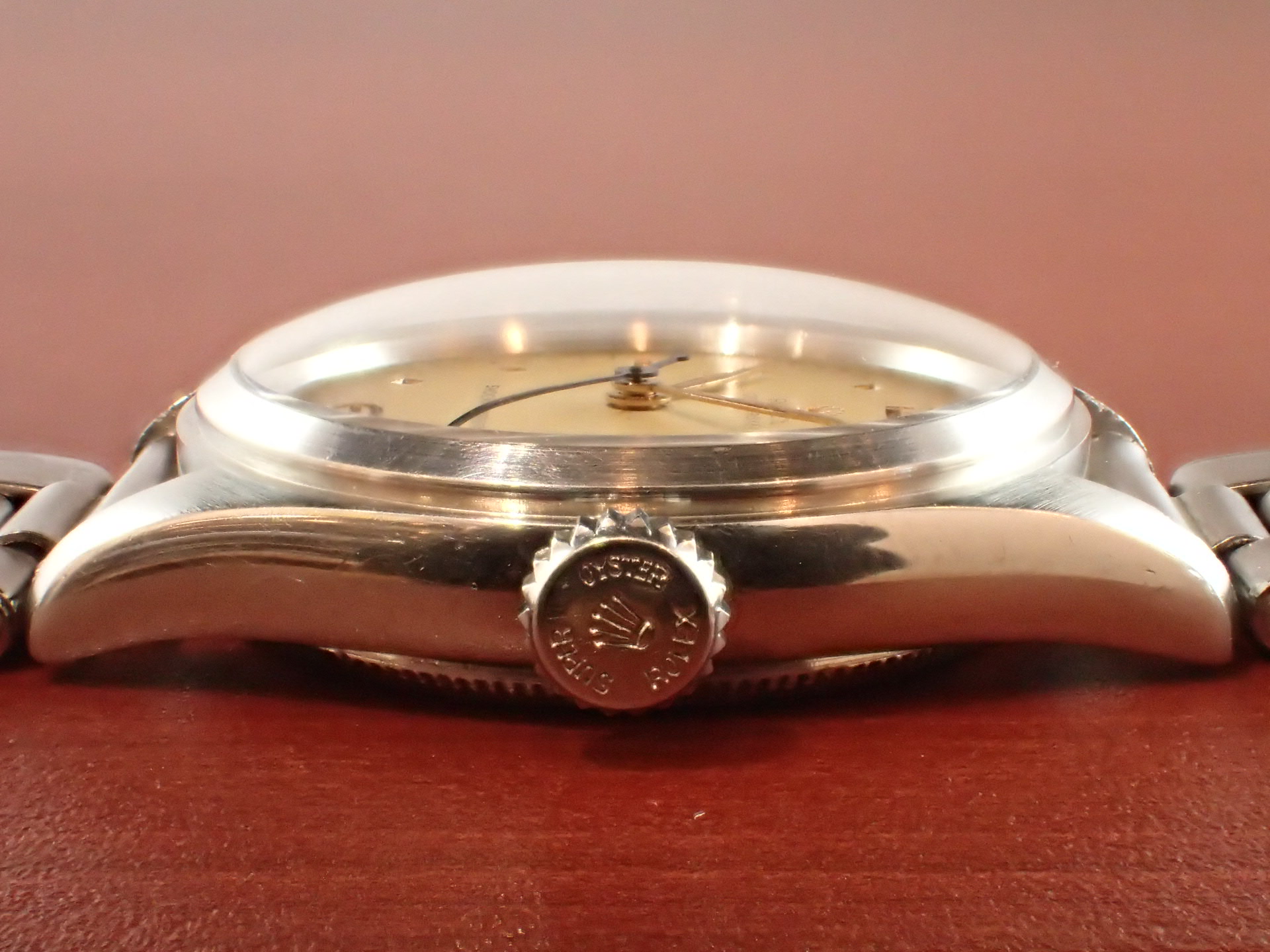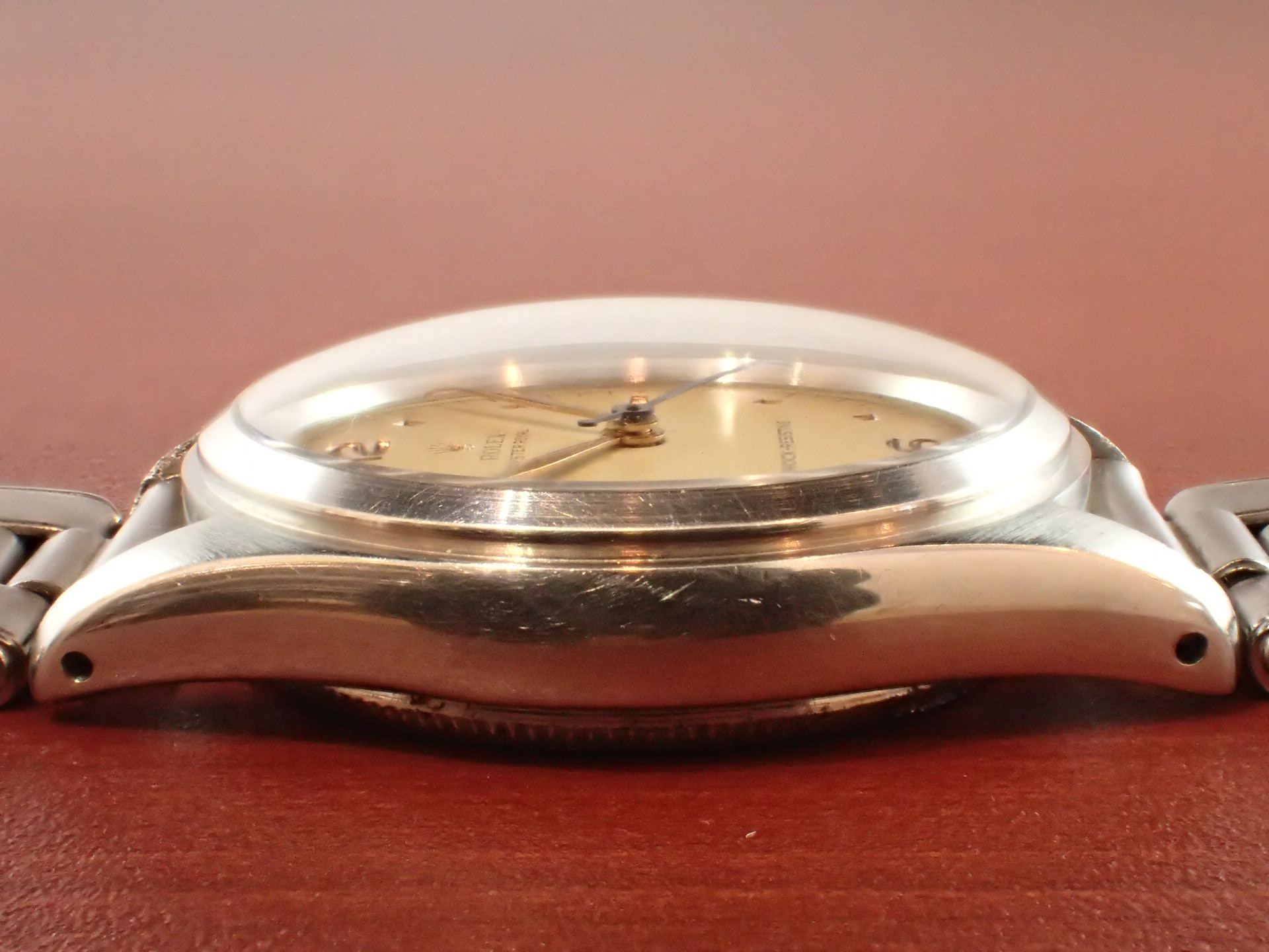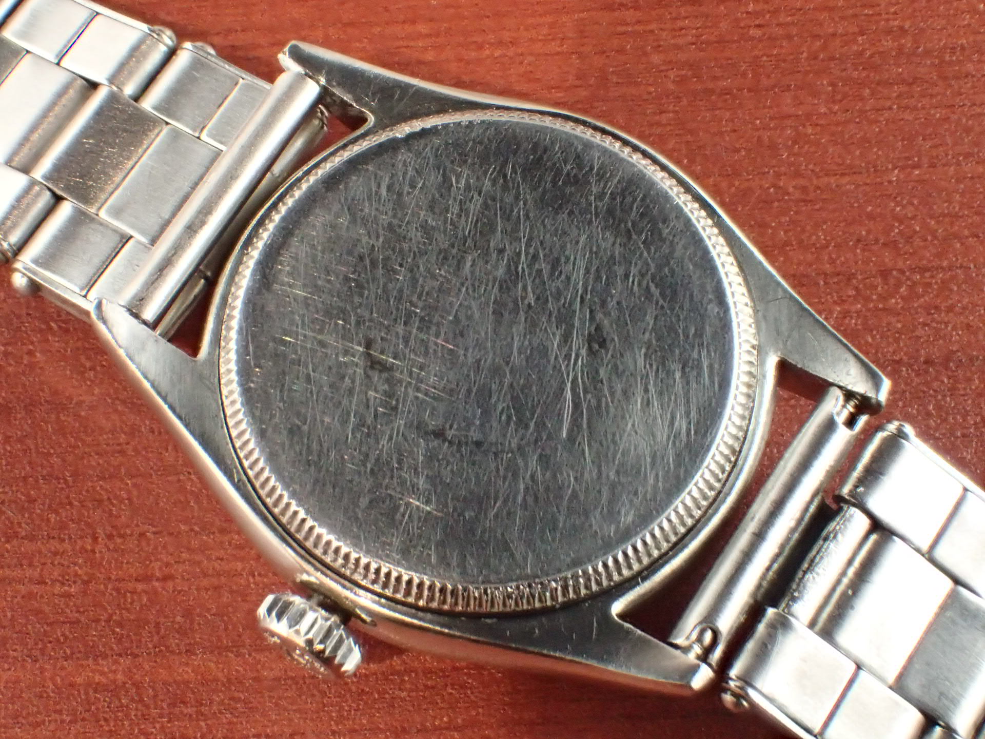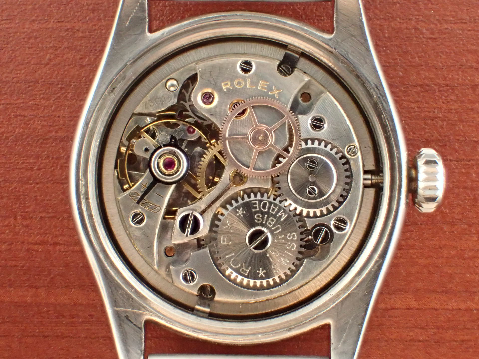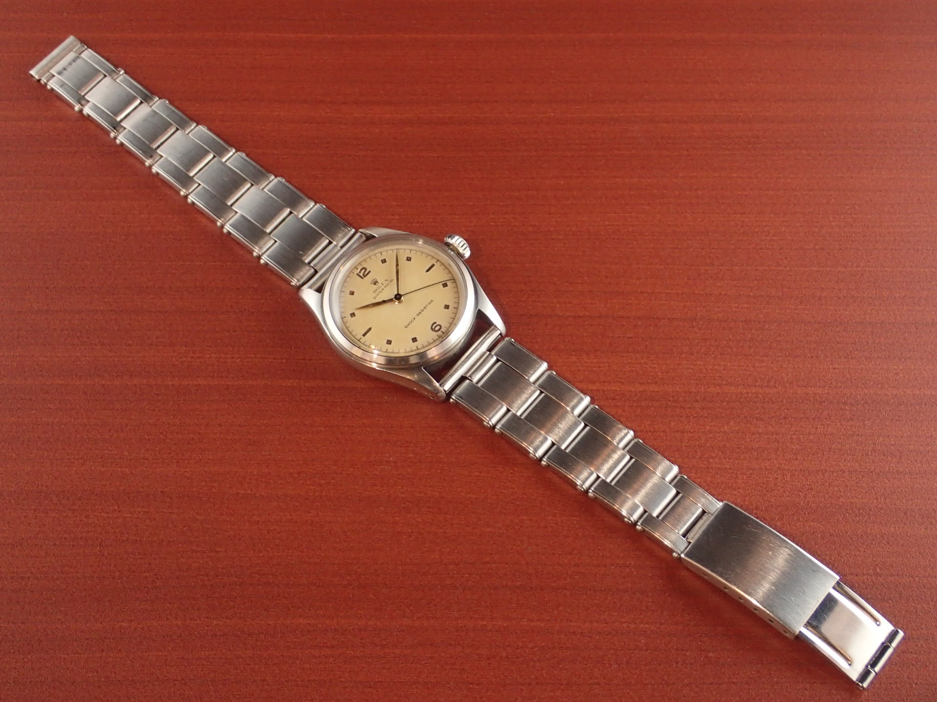 1950年代にロレックスが製造したボーイズサイズの手巻きモデルです。50年代のロレックスには様々な文字盤デザインが存在しますが、このモデルは、掘り込みの砲弾とピラミッドインデックスにリーフハンドの組み合わせです。ダイヤル全体が均一に経年変化した大変良い雰囲気です。秒針はブルースチールです。ケースは小傷とラグに若干にダメージがありますが、目立つ大きな傷はなく、概ね良好な状態です。ケースサイドのリファレンスナンバーやシリアルナンバーもしっかり読み取れます。ムーブメントは耐震装置付きです。ブレスレットは無銘のエクステンションブレスレットが取付けられています。分解掃除済みで日差30秒程度で稼働しています。