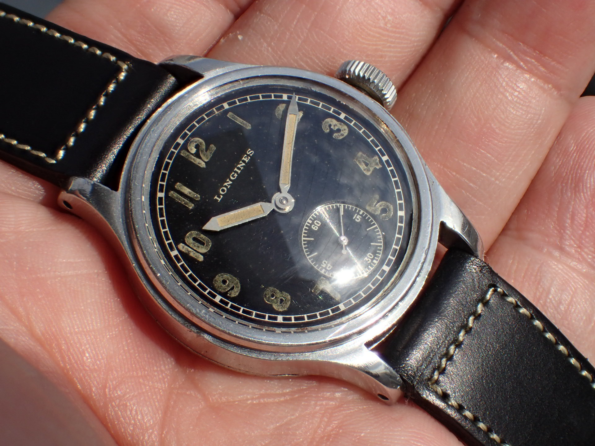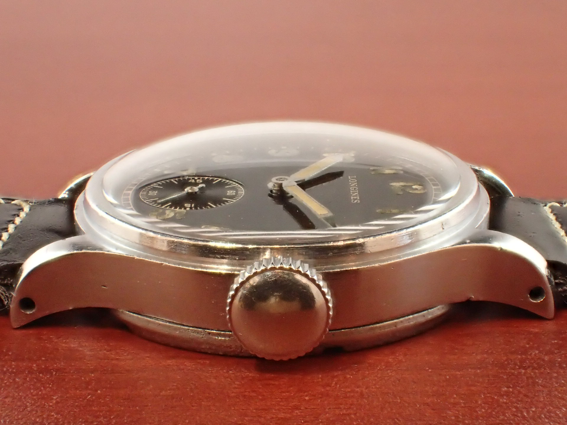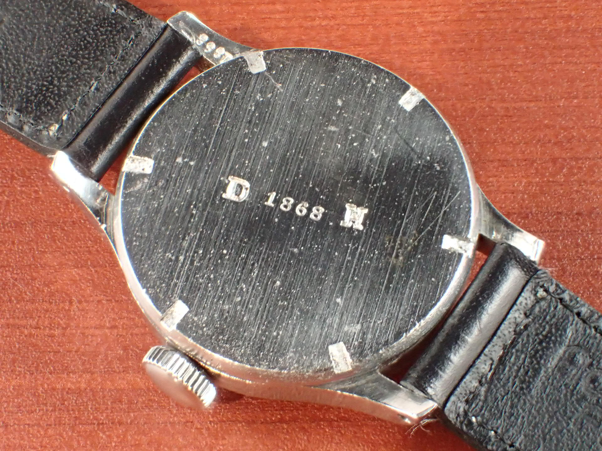 第二次世界大戦時にドイツ陸軍に支給されたロンジンのDHです。第二次世界大戦でドイツ陸軍に支給された通称「DH」は1942年~43年にかけて、様々なメーカーが製造しています。DとHの間の数字は支給シリアル番号で、メーカーごとではなく、すべてのDHの追番号となっています。ロンジンは5000番程度までで支給数は2000個程度と言われています。ロンジンはやはりクオリティが高いですね。がっちりと堅牢なつくり、ステップベゼルもカッコイイです。軍用時計としては、数少ないブラックミラーダイアルです。文字盤は経年変化があるものの、ツヤをしっかりと残した良い雰囲気です。ケースは多少の小傷と裏蓋に工具を滑らせたキズがあります。ムーブメントはショックレジスティングの耐震装置付きで綺麗です。分解掃除済みで日差30秒程度で稼働しています。