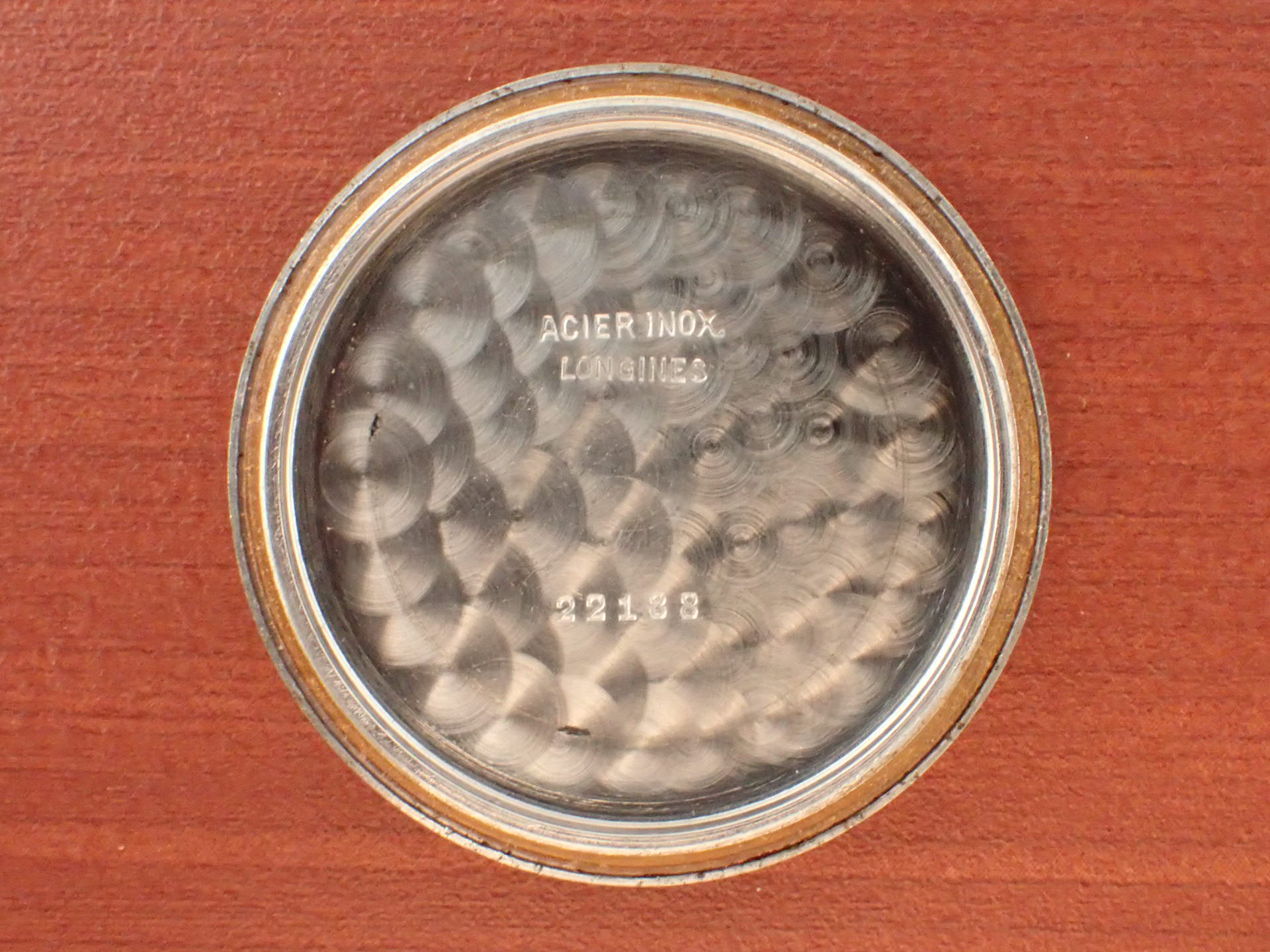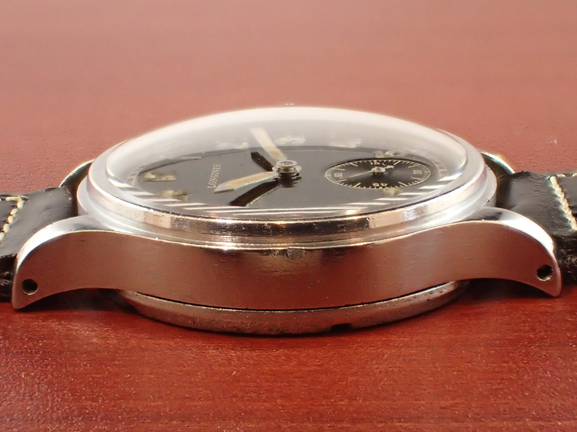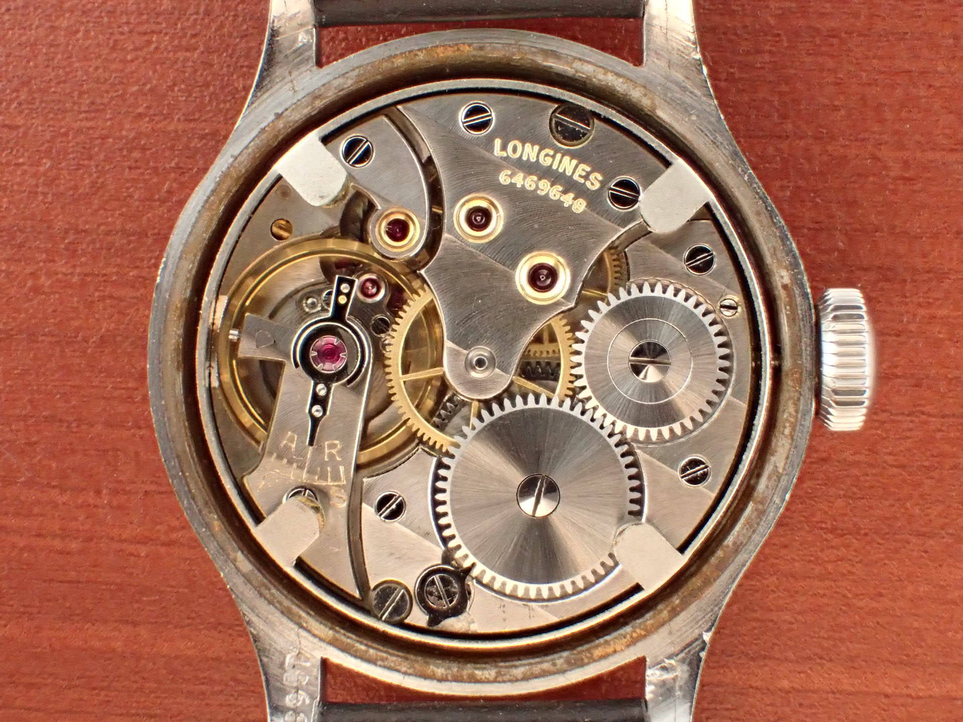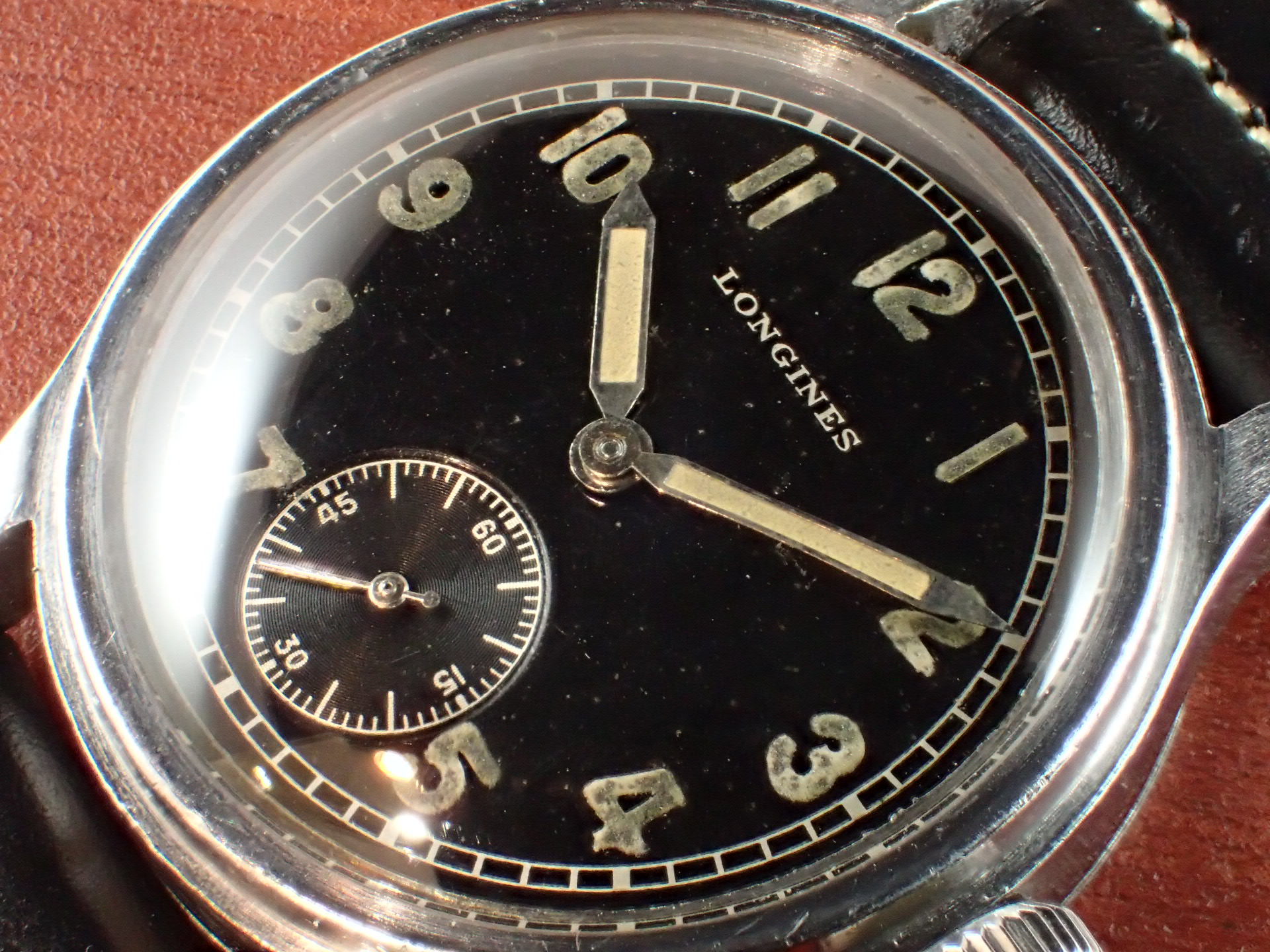 第二次世界大戦時にドイツ陸軍に支給されたロンジンのDHです。第二次世界大戦でドイツ陸軍に支給された通称「DH」は1942年~43年にかけて、様々なメーカーが製造しています。DとHの間の数字は支給シリアル番号で、メーカーごとではなく、すべてのDHの追番号となっています。ロンジンは5000番程度までで支給数は2000個程度と言われています。ロンジンはやはりクオリティが高いですね。がっちりと堅牢なつくり、ステップベゼルもカッコイイです。軍用時計としては、数少ないブラックミラーダイアルです。文字盤は経年変化があるものの、ツヤをしっかりと残した良い雰囲気です。ケースは多少の小傷と裏蓋に工具を滑らせたキズがあります。ムーブメントはショックレジスティングの耐震装置付きで綺麗です。分解掃除済みで日差30秒程度で稼働しています。